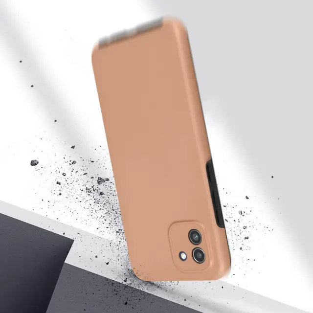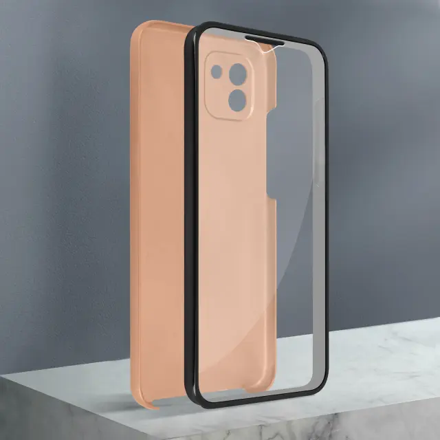 Ovitek za Samsung Galaxy A03 v roza barvi šampanjca. Ta vsestranska 360-stopinjska zašcita ima trdo zadnjo stran iz polikarbonata, odporno na udarce, in nezlomljivo sprednjo stran iz polimera, ki pokriva zaslon in stran telefona.