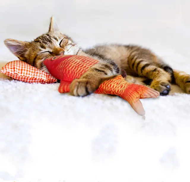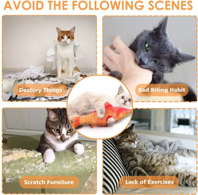 Realističen videz: Zahvaljujoč dizajnu in procesu 3D tiskanja je igračka riba videti kot prava riba. Realistične plišaste igrače so narejene iz bombaža in imajo kratko plišasto zunanjost. Ribica je trpežna, mehko bombažno polnilo pa ne poškoduje mačjih krempljev.