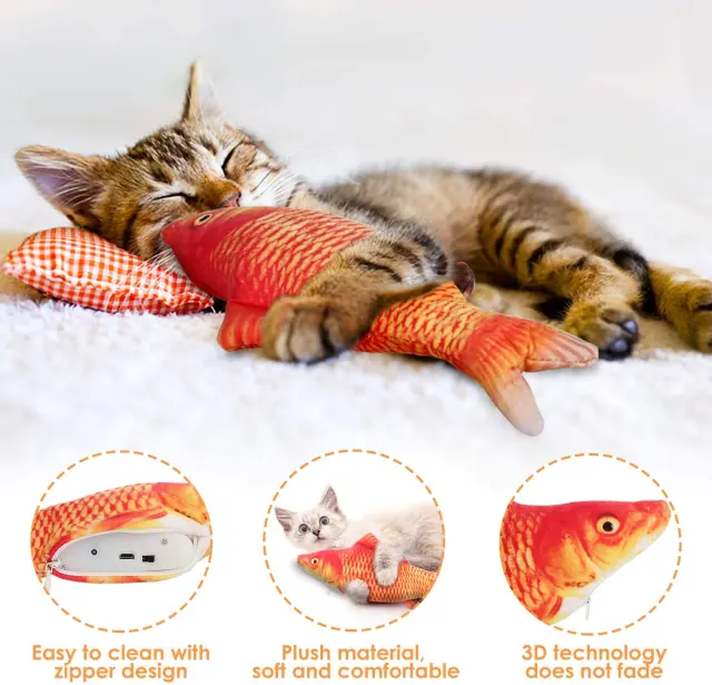 Interaktivna mačja igrača: popolna, ko niste doma ali nimate časa za igro! Igrača ima vgrajen senzor za dotik, tako da se ribica premika in čofota ter tako pritegne zanimanje mačke in navdihuje igro. Za polnjenje ribice uporabite priložen USB kabel.