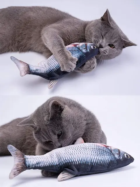 Pristen videz: Zahvaljujoč dizajnu in postopku 3D tiskanja je igračka riba videti kot prava riba. Realistične igrače so narejene iz bombaža in imajo kratko plišasto zunanjost. Ribica je trpežna, mehko bombažno polnilo pa ne poškoduje mačjih krempljev.