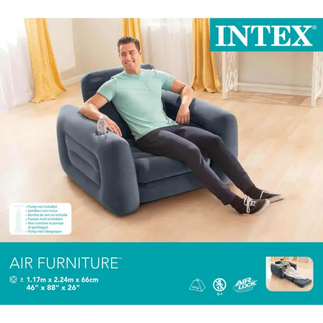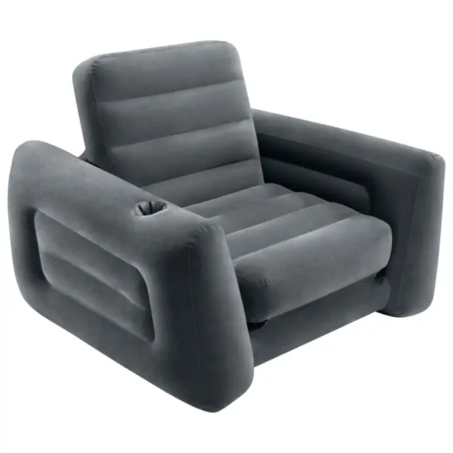 Ta raztegljiv stol s kosmičeno površino znamke Intex je zasnovan tako, da se boste lahko sproščali kjerkoli, ne glede na to, ali doma gledate TV, berete knjigo ali se samo sproščate na žametno mehkem stolu. Ko boste pripravljeni na spanje, samo raztegnite blazino v dve napihljivi vzmetnici.
