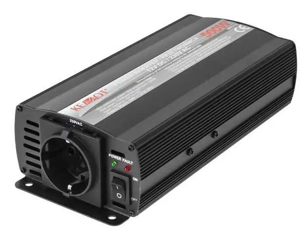 - Pretvornik napetosti - RMS pretvornik napetosti v avtomobilski 12VDC/230VAC - Izhodna moč: 500W - Maksimalna izhodna moč: 1000W - Napajanje: 12V DC (10-15 V) - Izhod: 230V + /-5V AC 50Hz - Notranja zaščita: - Nizka Battery Alarm (baterija) - Zaščita pred pregrevanjem - Zaščita pred preobremenitvijo - Zaščito pred kratkim stikom - Prenapetostna zaščita - Priključitev v cigaretni vžigalnik, komplet kablov s krokodili - Garancija: 1 leto