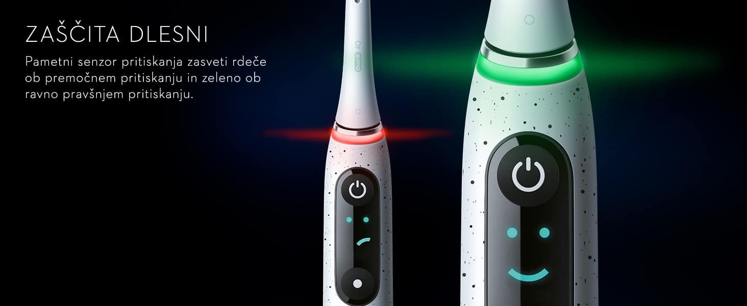 PAMETNI SENZOR PRITISKA v rdeči, beli in zeleni barvi kaže, ali ščetkate premočno, prerahlo ali z ustreznim pritiskom