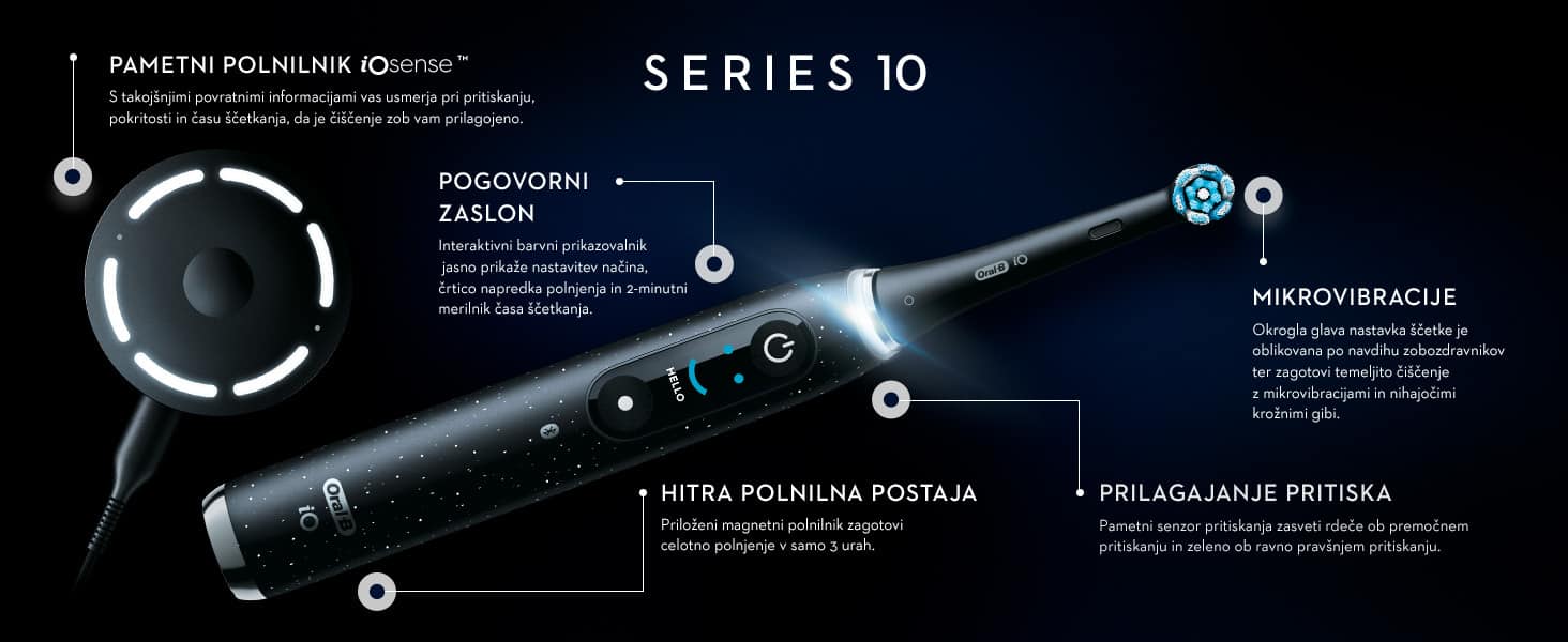 Električna zobna ščetka iO 10 z revolucionarnim pametnim polnilnikom iO Sense prilagodi ščetkanje s povratnimi informacijami v realnem času, ki vas vodijo, da dosežete optimalno pokritost in pritisk ter čas ščetkanja za čudovito enostavno čiščenje. Kombinacija nežnih mikrovibracij in edinstvene okrogle glave ščetke po navdihu zobozdravstvene opreme vam daje občutek profesionalnega čiščenja vsak dan. Za najboljše rezultate zamenjajte glavo zobne ščetke Oral-B iO vsake 3 mesece.