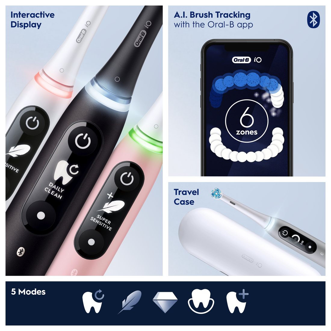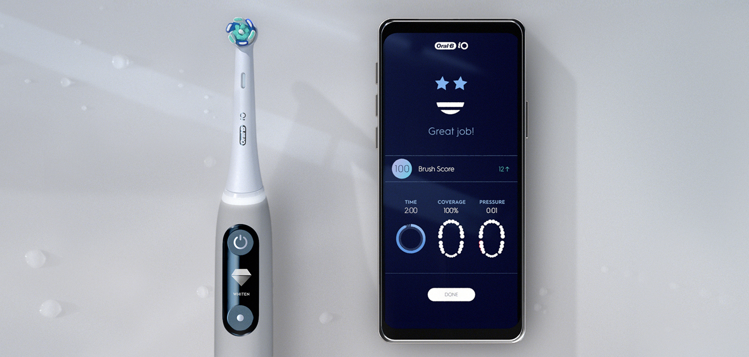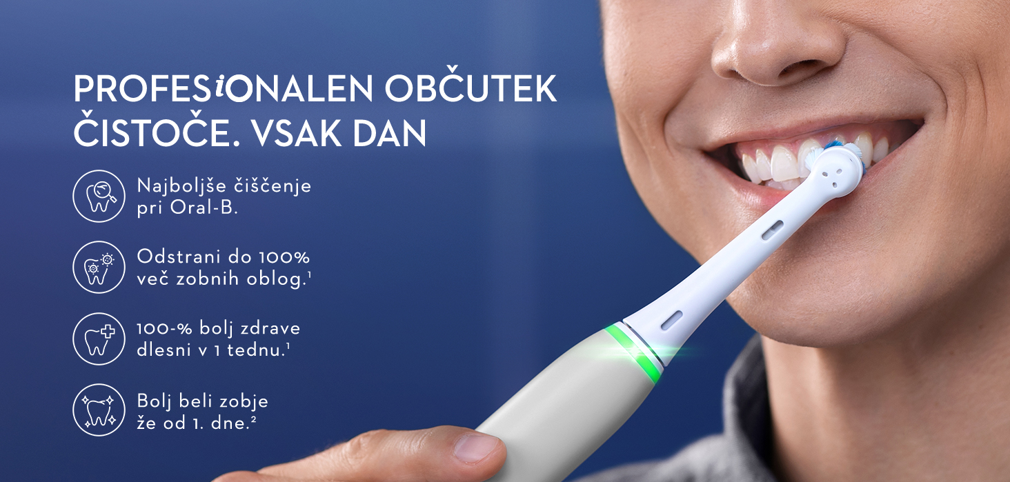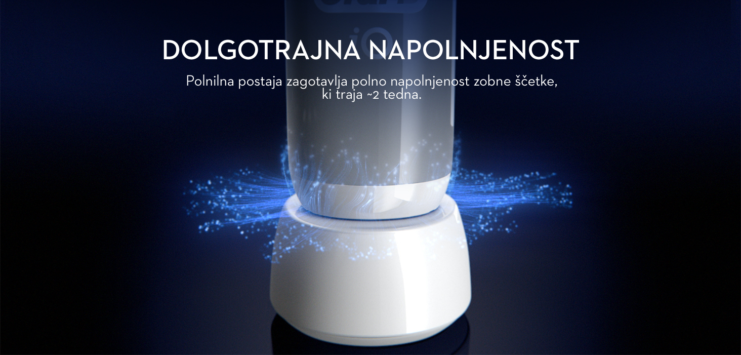 Revolucionarna tehnologija iO: Združitev edinstvenega okroglega nastavka za zobno ščetko Oral-B in nežnih mikrovibracij za presenetljivo prijetno izkušnjo ščetkanja ter zdrave zobe in dlesni za vse življenje.
