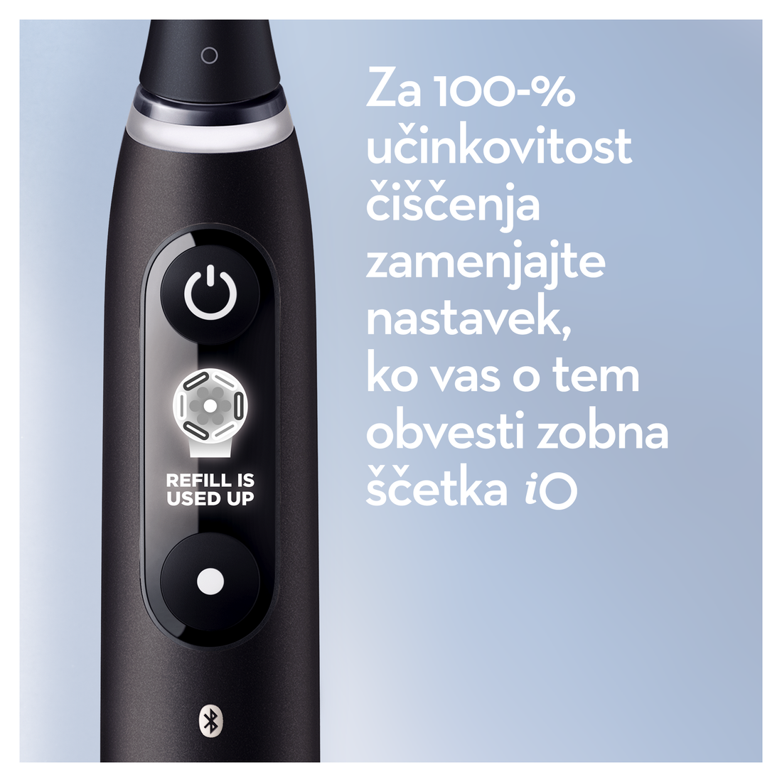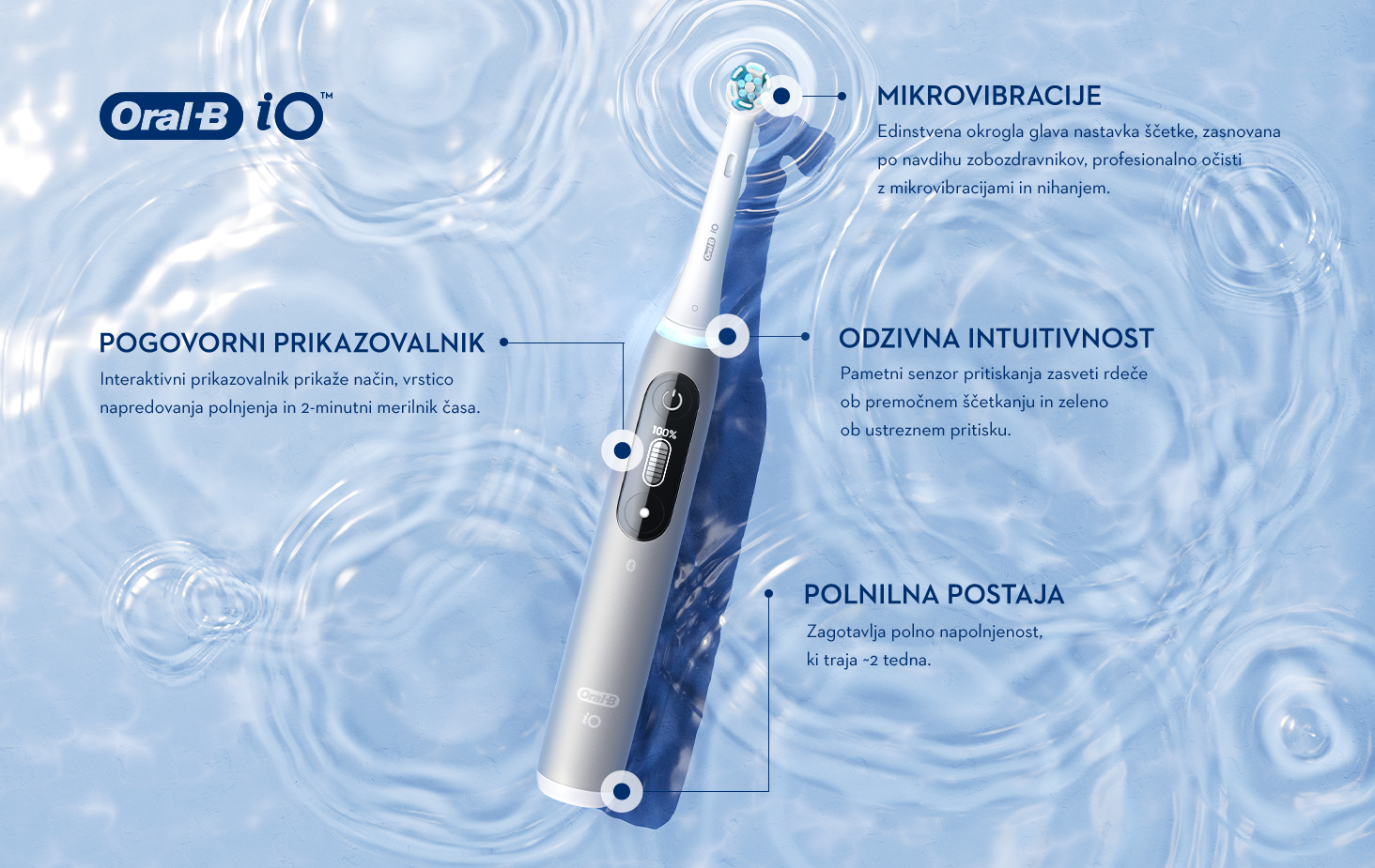 Revolucionarna tehnologija iO: Združitev edinstvenega okroglega nastavka za zobno ščetko Oral-B in nežnih mikrovibracij za presenetljivo prijetno izkušnjo ščetkanja ter zdrave zobe in dlesni za vse življenje.