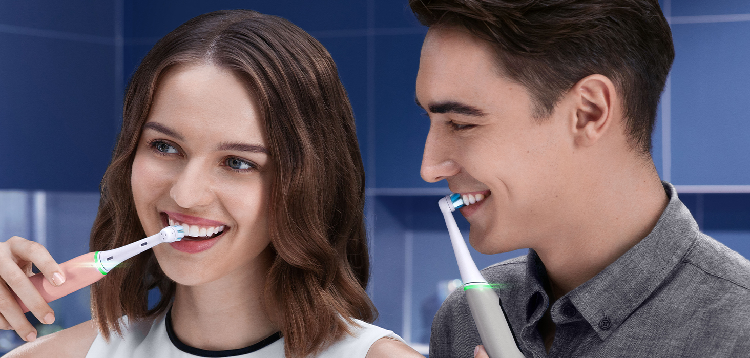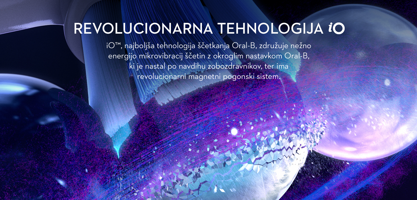 Revolucionarna tehnologija iO: Združitev edinstvenega okroglega nastavka za zobno ščetko Oral-B in nežnih mikrovibracij za presenetljivo prijetno izkušnjo ščetkanja ter zdrave zobe in dlesni za vse življenje.