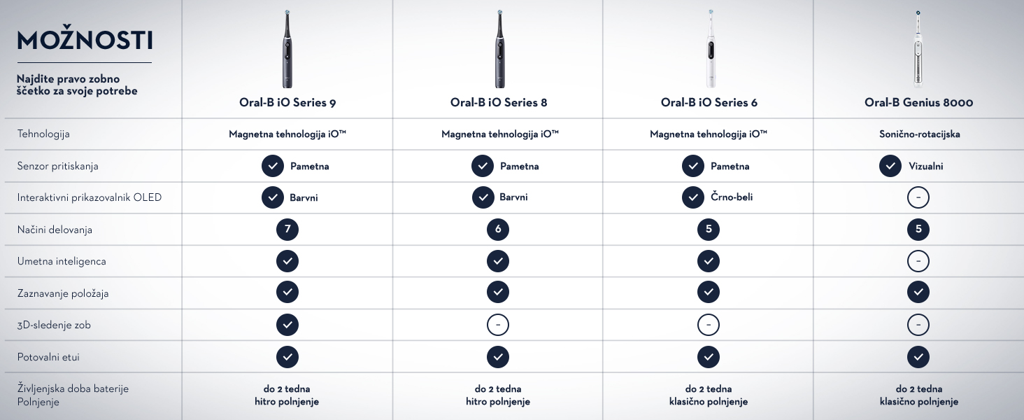 Inovativni magnetni pogonski sistem iO natančno dovaja energijo do konic ščetin, ki z nežnimi mikrovibracijami drsijo od zoba do zoba ter tako ustvarijo učinkovito in prijetno izkušnjo čiščenja. Izpopolnjeni pametni senzor pritiskanja vas opozori, ko ščetkate pravilno, ter tako poskrbi za zaščito dlesni. Tehnologijo iO odlikuje tudi interaktivni prikazovalnik, ki omogoča osebno prilagojeno vodenje med ščetkanjem v realnem času ter nastavitve zobne ščetke po meri. Umetna inteligenca Oral-B iO vas v aplikaciji Oral-B vodi do najbolj temeljitega čiščenja. Doživite ščetkanje zob, ki ga boste videli, slišali in čutili drugače.