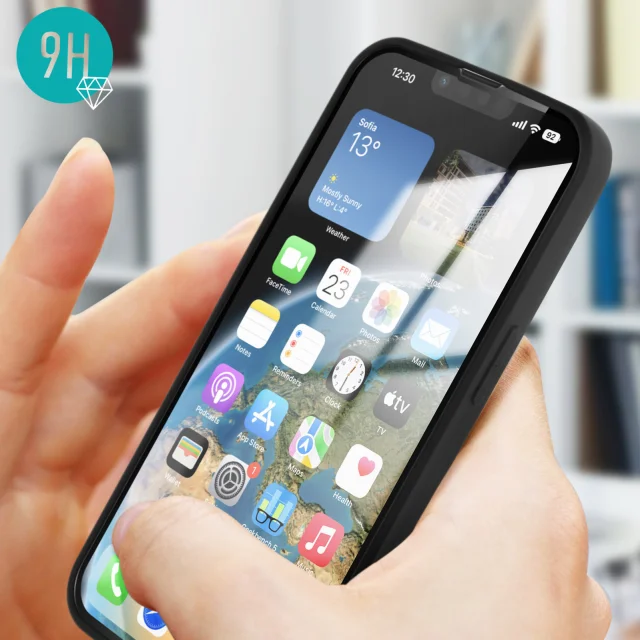 iPhone 14 Plus Full Protection, mat crn silikonski ovitek kaljeno steklo 9H crn obris
