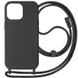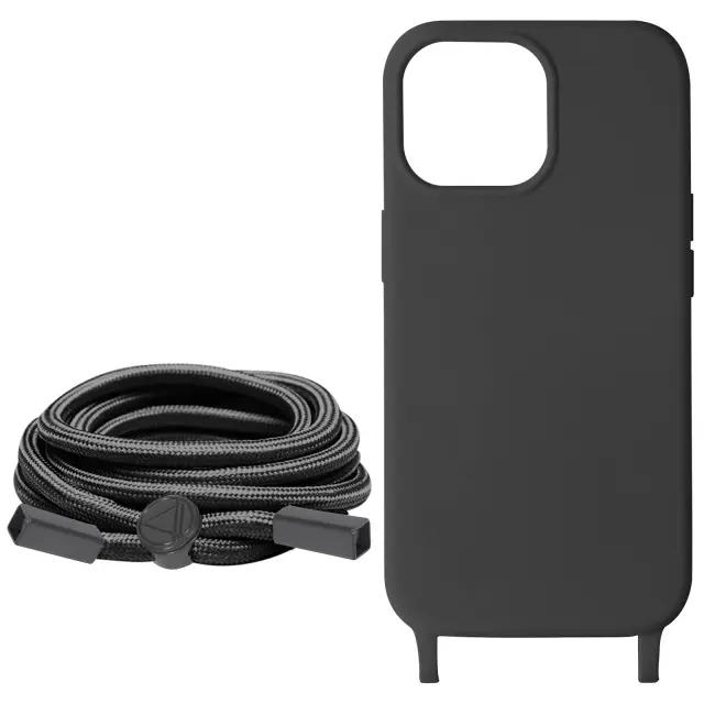 Apple iPhone 15 Pro Max black cord etui iz serije Corda. Ovitek za iPhone 15 Pro Max iz polikarbonata in gel silikona. Zašcita za iPhone 15 Pro Max z 80 cm pletenim najlonskim trakom za nošenje mobilnega telefona okoli vratu ali kot naramnica.