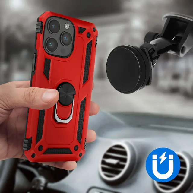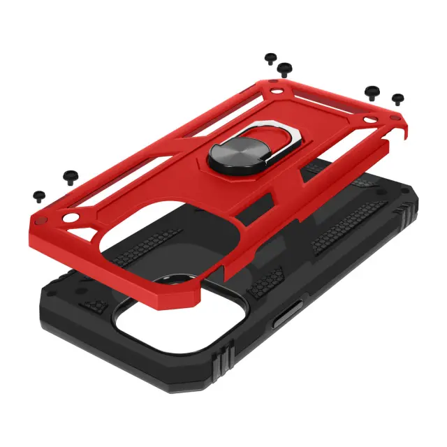 ArmoRing serija rdeci hibridni ovitek za iPhone 15 Pro Max. Odporna zašcita pred udarci. Opremljen je z vrtljivim transportnim obrocem, ki se lahko uporablja kot podpora za video in je združljiv z magnetnimi mediji.