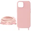 Apple iPhone 15 roza ovitek s vrvico iz serije Corda. Ovitek za iPhone 15 iz polikarbonata in gel silikona. Zašcita za iPhone 15 z nastavljivim 80 cm pletenim najlonskim trakom za nošenje telefona okoli vratu ali kot naramnica.