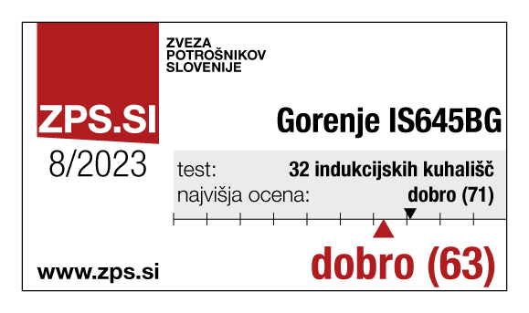 Na testu neodvisne organizacije Zveza potrošnikov Slovenije (ZPS) je indukcijska kuhalna plošča oz. kuhališče Gorenje IS645BG prejelo oceno DOBRO (63) med 32 različnimi testiranimi kuhališči. Organizacija je pristopila k testiranju v vlogi kot bi nakup opravil običajni potrošnik, v neodvisnih akreditiranih laboratorijih. Njihovi kriteriji, ki segajo preko standardov in varnosti, vključujejo tudi uporabnost izdelka, okoljevarstvo in druge vidike vsakodnevne uporabe. Več si preberite v novici.