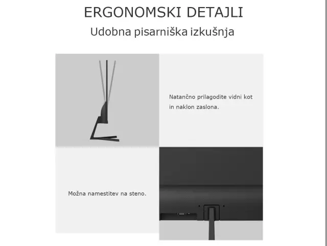 Nadzor monitorja je izveden preko fizičnih gumbov, kar zagotavlja intuitivno in enostavno upravljanje. S tem boste lahko hitro prilagodili nastavitve zaslona glede na vaše potrebe.