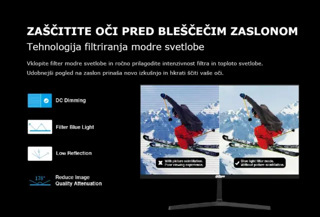 Zaščita pred modro svetlobo je ena izmed ključnih lastnosti tega monitorja, kar je pomembno za zaščito oči. Ta funkcija pomaga zmanjšati škodljive učinke modre svetlobe, ki jo oddajajo zasloni, in s tem zagotavlja bolj prijazno izkušnjo gledanja, brez napora za oči.