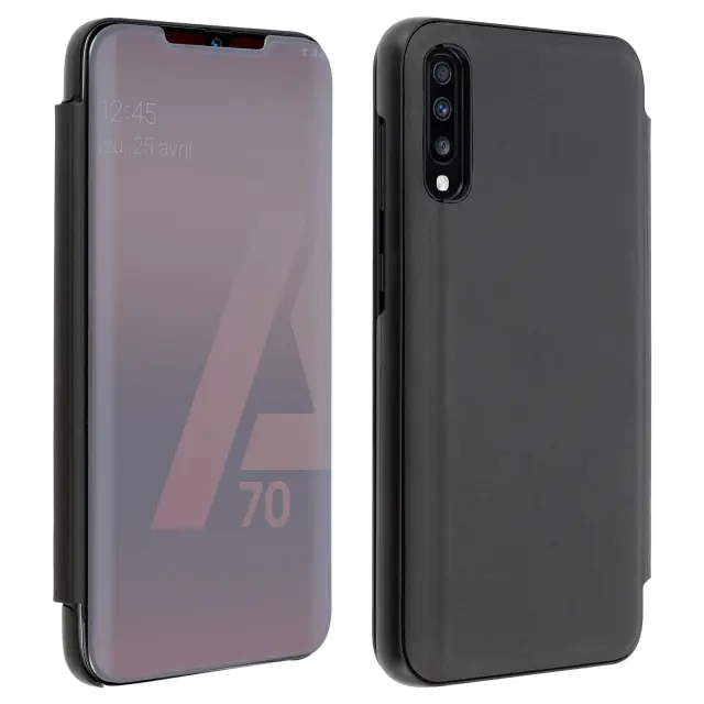 Zaščitna torbica posebej oblikovana za Samsung Galaxy A70. Eleganten dizajn z učinkom ogledala za edinstveno upodobitev, črna. Prosojna loputa za enostaven ogled časa, obvestil itd. Zaščitni pokrov iz polikarbonata po meri.