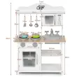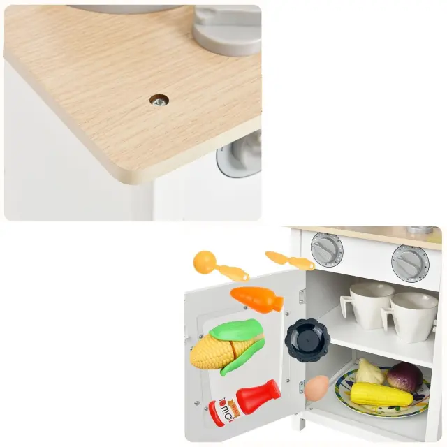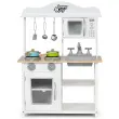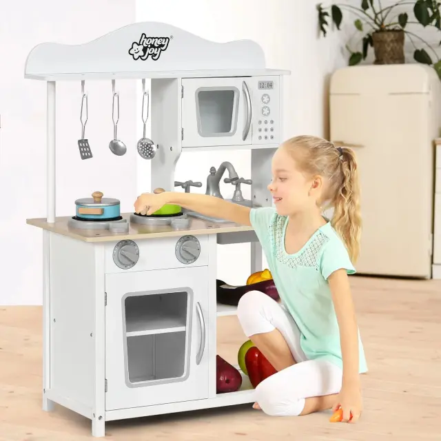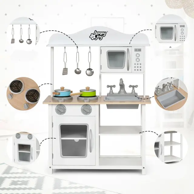 Ima pečico, pomivalno korito, kuhalno ploščo z gumbi in dve polici, tako da lahko otroci sproščajo paro po mili volji. Poleg tega izboljšuje njihove praktične in socialne spretnosti. Kuhinja je izdelana iz visokokakovostnih plošč MDF, zato je trdna in vzdržljiva, zaradi nestrupenih materialov pa je njena uporaba za otroke varna. Zato je odlično darilo za rojstni dan ali božič. Ne zamudite te edinstvene priložnosti!