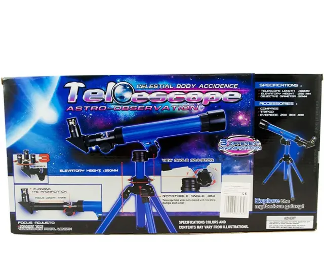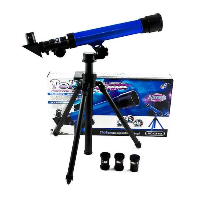 Popolna igrača za bodoče astronome. Teleskop z izmenljivimi lečami različnih jakosti (20x, 30x, 40x). Teleskop ima stojalo, ki ga je mogoče vrteti za 360 stopinj. Stojalo je tudi nastavljivo po višini.