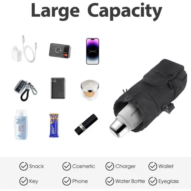 Prostorno in organizirano: Poleg prostora za steklenico za vodo ima ta torba tudi dodaten prostor za shranjevanje vaših najnujnejših stvari. Ima predelke in žepe za urejeno shranjevanje telefona, polnilnih kablov, slušalk, kartic, ključev in drugih majhnih predmetov.