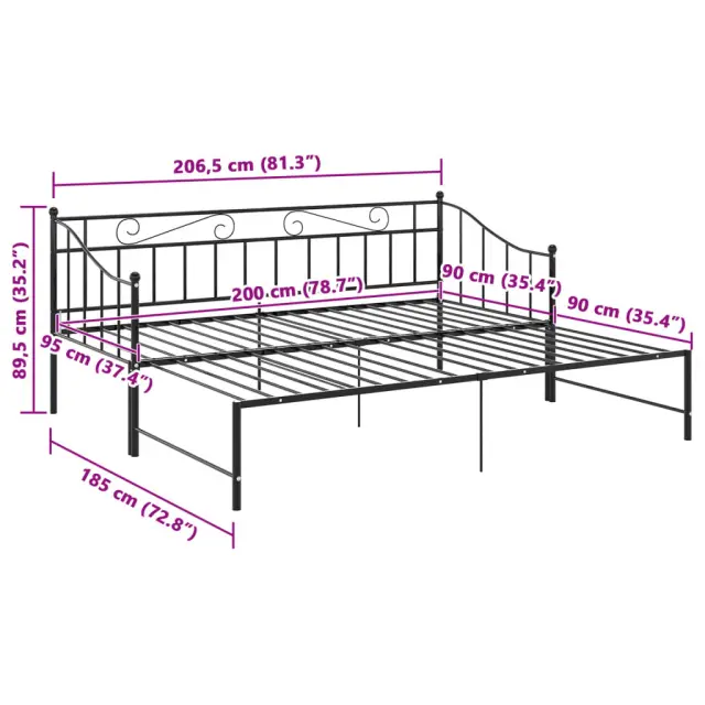 Ta vsestranski kavč z ležiščem bo popoln za namestitev nepričakovanih gostov, ki bodo pri vas prespali. Hkrati bo zagotovil tudi udoben prostor za sedenje čez dan. Ta kos pohištva lahko podnevi enostavno spremenite v kavč, ponoči pa v udobno posteljo. Okvir dnevne postelje bo dobro izkoristil prostor, ki ga imate na voljo, ter zagotovil prostor za spanje dveh ljudi, zato je popolna izbira za tiste, ki nimate veliko prostora. Poleg tega je postelja za goste opremljena s stranskim vodilom, ki bo uporabniku preprečilo da bi se zvalil iz postelje. Celoten posteljni okvir ima trdno kovinsko konstrukcijo, ki zagotavlja trpežnost in stabilnost za vsakodnevno uporabo. Prosimo, upoštevajte: Paket vsebuje samo posteljni okvir. Vzmetnica ni priložena. V trgovini si lahko ogledate primerno vzmetnico.Barva: ČrnaMaterial: Kovina s prašnim premazomDimenzije ležišča (ko je raztegnjeno): 206,5 x 185 x 89,5 cm (D x Š x V)Dimenzije ležišča (ko ni raztegnjeno): 206,5 x 95 x 89,5 cm (D x Š x V)Velikost primerne vzmetnice: 90 x 200 cm (Š x D) (vzmetnica ni priložena)Kavč z majhno posteljo se lahko raztegnePotrebno sestavljanje: Da