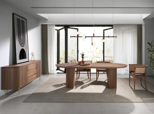 Jedilna miza iz orehovega lesa, model 1104 Angel Cerdá S.L. Jedilna miza s fiksno ovalno ploščo iz naravnega orehovega furnirja debeline 0,5 mm. Sodoben stilski kos z izvirno in inovativno zasnovo. Vsaka podrobnost je bila premišljena, da bi vam ponudila največje udobje in tudi oblikovalski kos za vašo jedilnico. STIL: Ta jedilna miza z brezčasnim dizajnom iz naravnega orehovega furnirja bo postala glavni protagonist vaše dnevne sobe. VEČSTILNOST: Njena elegantna struktura bo poskrbela za prefinjen, sodoben in minimalističen pridih, ki ga iščete v svojem domu. KAKOVOST: Vsi naši izdelki so izdelani iz materialov najvišje kakovosti, kar je zagotovilo za trajno in funkcionalno pohištvo. DEKORACIJA: Ta edinstvena in sodobna jedilna miza iz orehovega furniranega lesa in zlatega nerjavečega jekla se bo odlično ujemala z različnimi dekorativnimi slogi ter ustvarila toplo in prijetno vzdušje. RAZMERE IN UDOBJE: Zaradi velikosti in napol ovalne oblike njenega krožnika postane ta miza brezčasnega dizajna popoln kos za ustvarjanje očarljivega prostora za srečanja večjega števila jedcev. MOŽNOSTI: Dekorativni stranski detajli dodajo osebni in prepoznavni pridih. To vsestransko jedilno mizo lahko kombinirate z drugim pohištvom iz iste kolekcije in ustvarite sanjski prostor v svoji jedilnici ali dnevni sobi.