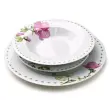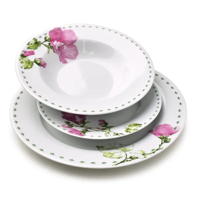 Jedilni servis LEA MALLOW (18-delni) iz kakovostnega porcelana AFFEKDESIGN by MONDEX prinaša eleganten, brezčasen videz pogrinjka. Bela podlaga z nežnim cvetličnim vzorcem v rožnato-zelenih odtenkih je primerna tako za vsakodnevno uporabo kot tudi za posebne priložnosti, pri čemer ohranja urejen in prefinjen videz mize.