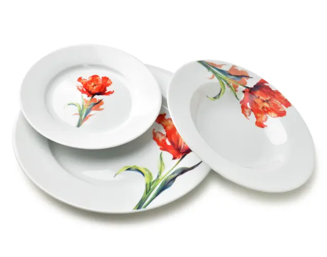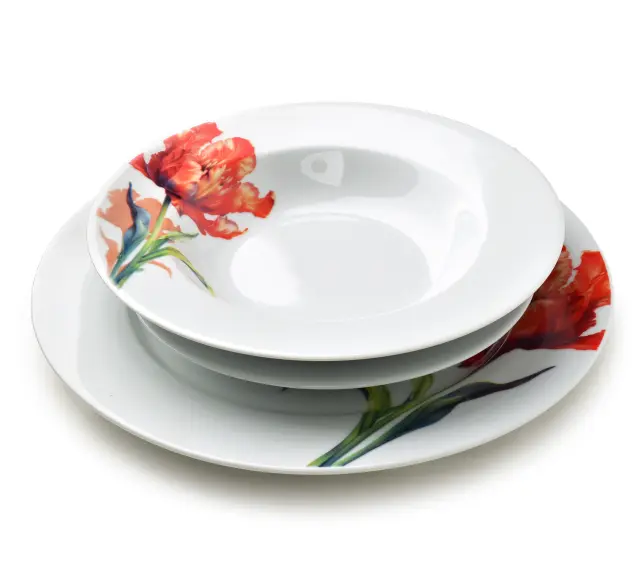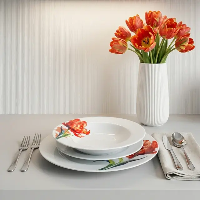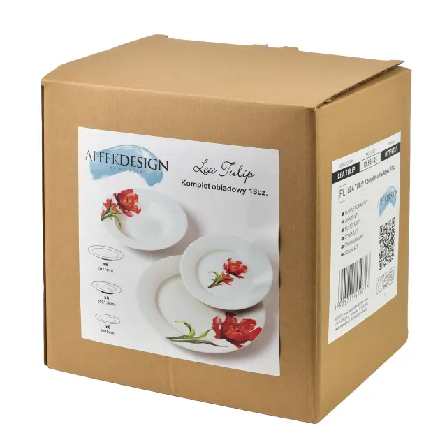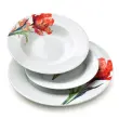 Porcelanasti jedilni servis MONDEX Lea Tulip je 18-delni komplet za 6 oseb, ki združuje čistino bele podlage in izrazit rdeč cvetlični motiv tulipana. Primeren je za vsakodnevno uporabo, družinska kosila in postrežbo ob posebnih priložnostih, saj klasična oblika krožnikov lepo poudari jedi in omogoča udobno serviranje.
