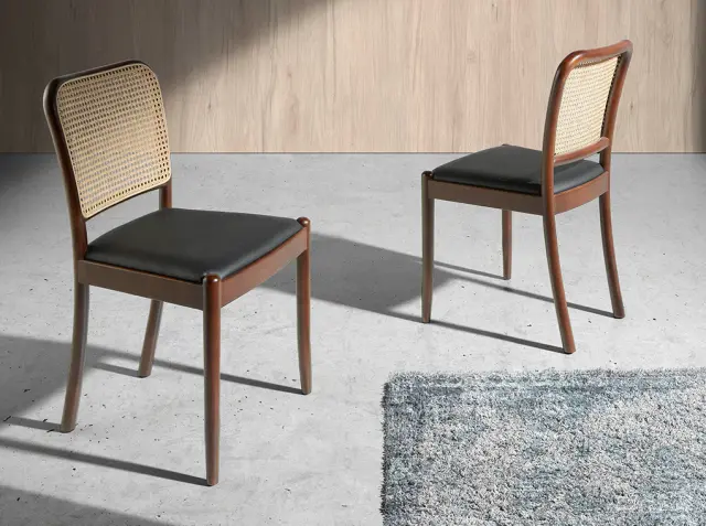 Jedilni stol s kvadratnim ogrodjem iz ratana, model 4094 Angel Cerdá S.L. Jedilni stol iz masivnega jesenovega lesa, pobarvanega v barvi oreha, z udobnim sedežem, oblazinjenim v črno eko usnje in polnjenim s 25 kg/m3 poliuretana. Njegovo izvirno naslonjalo iz mrežastega ratana bo vašemu domu dodalo tisti pridih trenda in elegance, ki ga iščete. Ta sodobno oblikovan stol Angel Cerdá združuje edinstven slog in osebnost znamke ter največje udobje in stabilnost zaradi mehkega oblazinjenja in izvirne strukture nog. Oblikovalski kos, ki ne bo manjkal v vaši jedilnici. - STIL: Ta izvirni jedilni stol s sodobnim dizajnom bo poskrbel za drugačen in eleganten pridih, ki ga iščete v svojem domu in je zvest najnovejšim trendom v dekoriranju. - Vsestranski in funkcionalni dizajn omogoča, da se prilega vsaki vrsti dnevne sobe ali jedilnice in postane glavni junak prostora. - KAKOVOST: Vsi naši jedilni stoli so izdelani iz najkakovostnejših materialov, kar zagotavlja dolgotrajno in funkcionalno pohištvo. - DEKORACIJA IN UDOBJE: Zaradi izvirne zasnove, izdelane iz materialov, kot je ratan v naslonu, v kombinaciji s črnim usnjem, boste dobili drugačen in prepoznaven dotik, ki ga iščete za svojo jedilnico. - MERE: Velikost sedeža in oblazinjenje iz poliuretanske pene 25 kg/m3 vam bosta omogočila največje udobje, pri tem pa ne boste zapustili najvišjega trenda