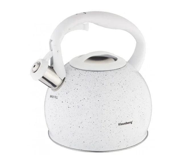 3,0L jeklen kotliček iz visokokakovostnega INOX nerjavečega jekla. - BELA marmorirana, mat površina. - Primerno za vse vrste štedilnikov in kuhališč: električne, steklokeramične, plinske, halogenske, indukcijske. - Opremljen z zložljivo piščalko in silikonsko prevlečenim ročajem, ki se ne segreva. - Moderna oblika in videz. - Priročen gumb za odpiranje piščalke, preprečuje opekline.