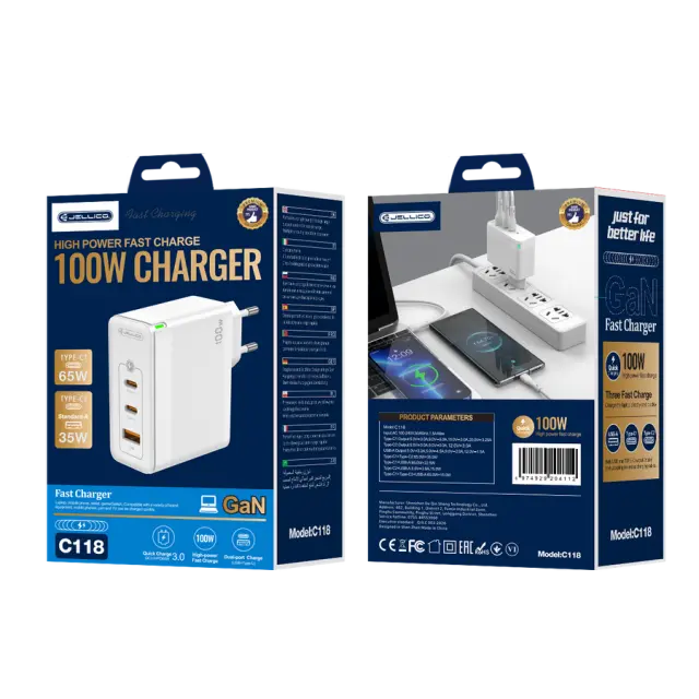 Novi polnilnik Jellico 3-port vam omogoča hitro polnjenje več naprav hkrati. Z uporabo polprevodnikov Gan in moči jedra 100W in široke združljivosti omogočata polnjenje do 3 naprav hkrati.