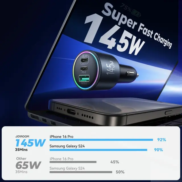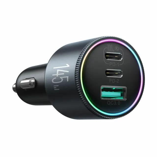 Joyroom JR-CCN07 je večizhodni avtomobilski polnilec za vozila z napetostjo 12 do 24 V. Omogoča sočasno polnjenje do treh naprav z največjo skupno močjo 145 W. Dva USB-C priključka podpirata Power Delivery 3.0 in PPS, USB-A pa standarde QC, AFC in FCP, kar omogoča združljivost s širokim naborom mobilnih naprav in prenosnikov.