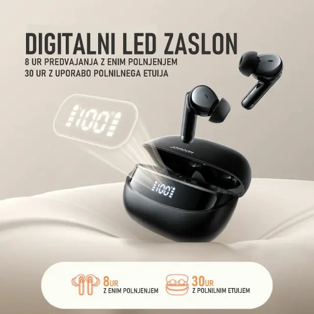 Joyroom JR-BB3 so lahke in priročne brezžične slušalke za v uho, ki omogočajo do 7–8 ur predvajanja z enim polnjenjem ter skupno do 30 ur z uporabo polnilnega etuija. Opremljene so z LED zaslonom za prikaz baterije, ENC tehnologijo za zmanjšanje šumov ter AI-podprto funkcijo za jasnejše klice.