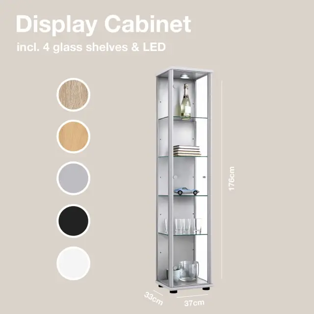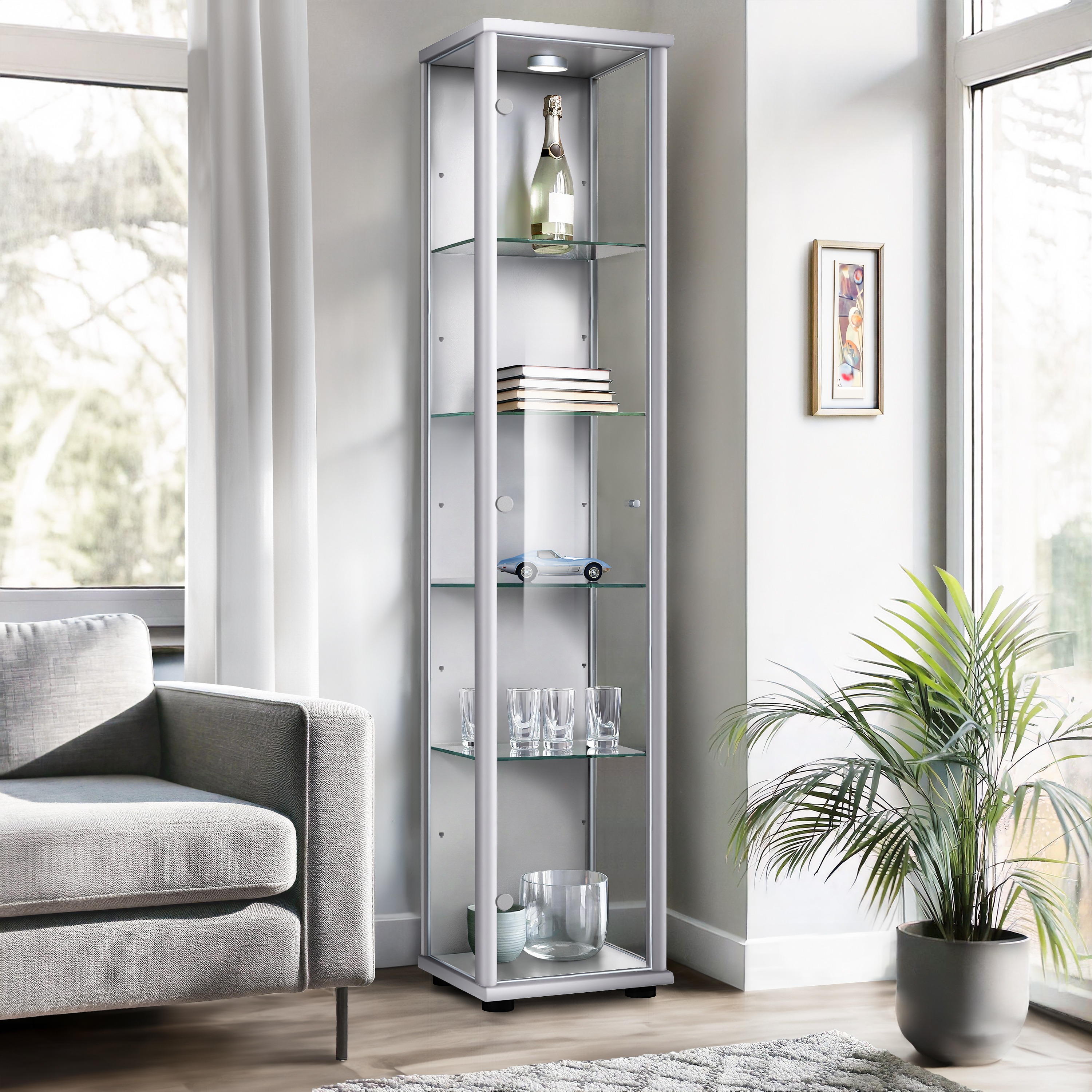 K-Möbel steklena vitrína stoječa (176x37x33cm) - Made in Germany - vitrinasta omara srebrna / aluminij s 4 nastavljivimi steklenimi policami & LED