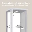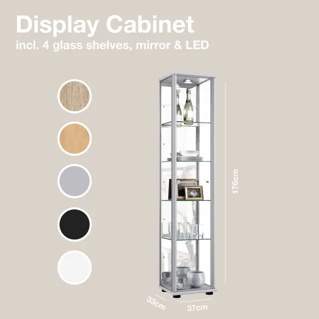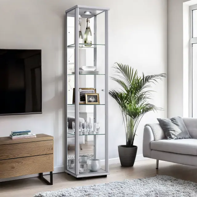 K-Möbel stoječa vitrína (176x37x33cm) - Made in Germany - vitrinasta omara srebrna / aluminij s 4 nastavljivimi steklenimi policami, ogledalo & LED