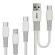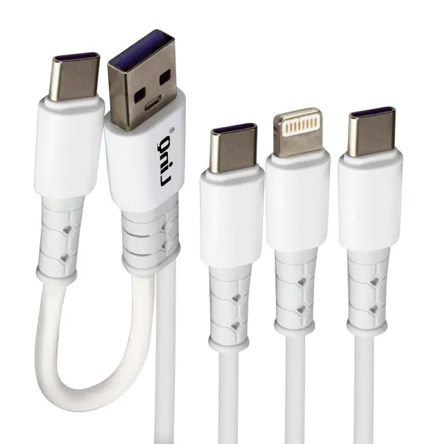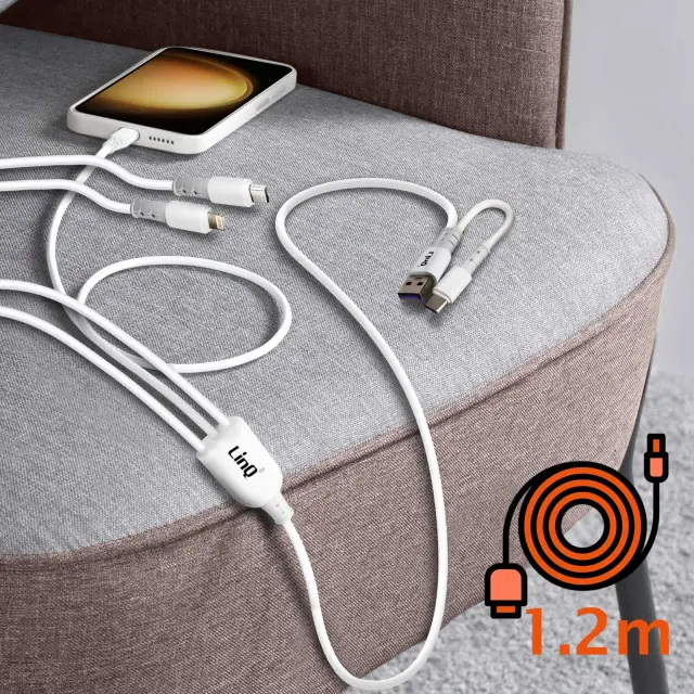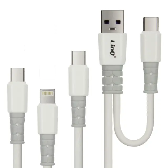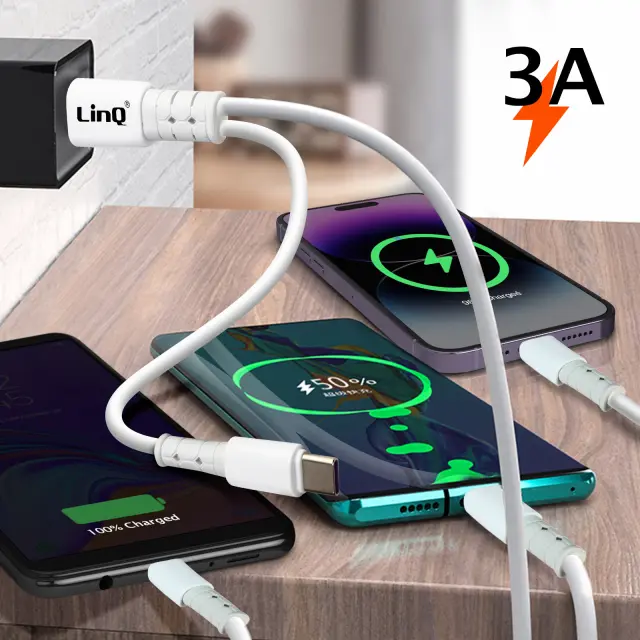 Dvojni vhodni kabel USB-A / USB-C do USB-C / Lightning / Micro-USB podjetja LinQ za polnjenje vseh vaših mobilnih naprav s katerim koli virom napajanja. Njegova jakost 3 A zagotavlja hitro polnjenje. Optimalna dolžina 1,2 m.