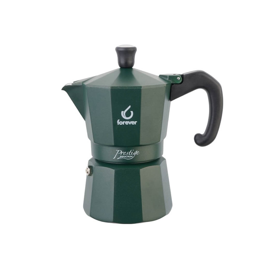 Forever kafetiera Miss Prestige ima klasično navdihnjeno aluminijasto zasnova v obliki tipične italijanske kafetiere. Večplastno feritno dno omogoča uporabo na vseh kuhalnih površinah, vključno z indukcijo. Kafetiera v prašno lakirani mat zeleni barvi je idealna za pripravo treh skodelic aromatične kave. Zaradi aluminijastega materiala jo operite ročno, svetujemo samo z vodo, da ohranite prvinsko aromo kave. Kafetiera je s svojo sodobno zasnovo in funkcionalnostjo idealna za vse ljubitelje kave, ki želijo hitro in enostavno pripraviti svoj najljubši napitek.