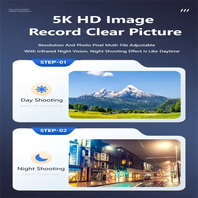 Vsestranske možnosti snemanja: Ta naprava združuje snemanje osupljivih videoposnetkov 1080P z možnostjo fotografiranja v visoki ločljivosti. S funkcijo snemanja zvoka ni ujet le trenutek, temveč tudi zvok, ki izboljša izkušnjo.