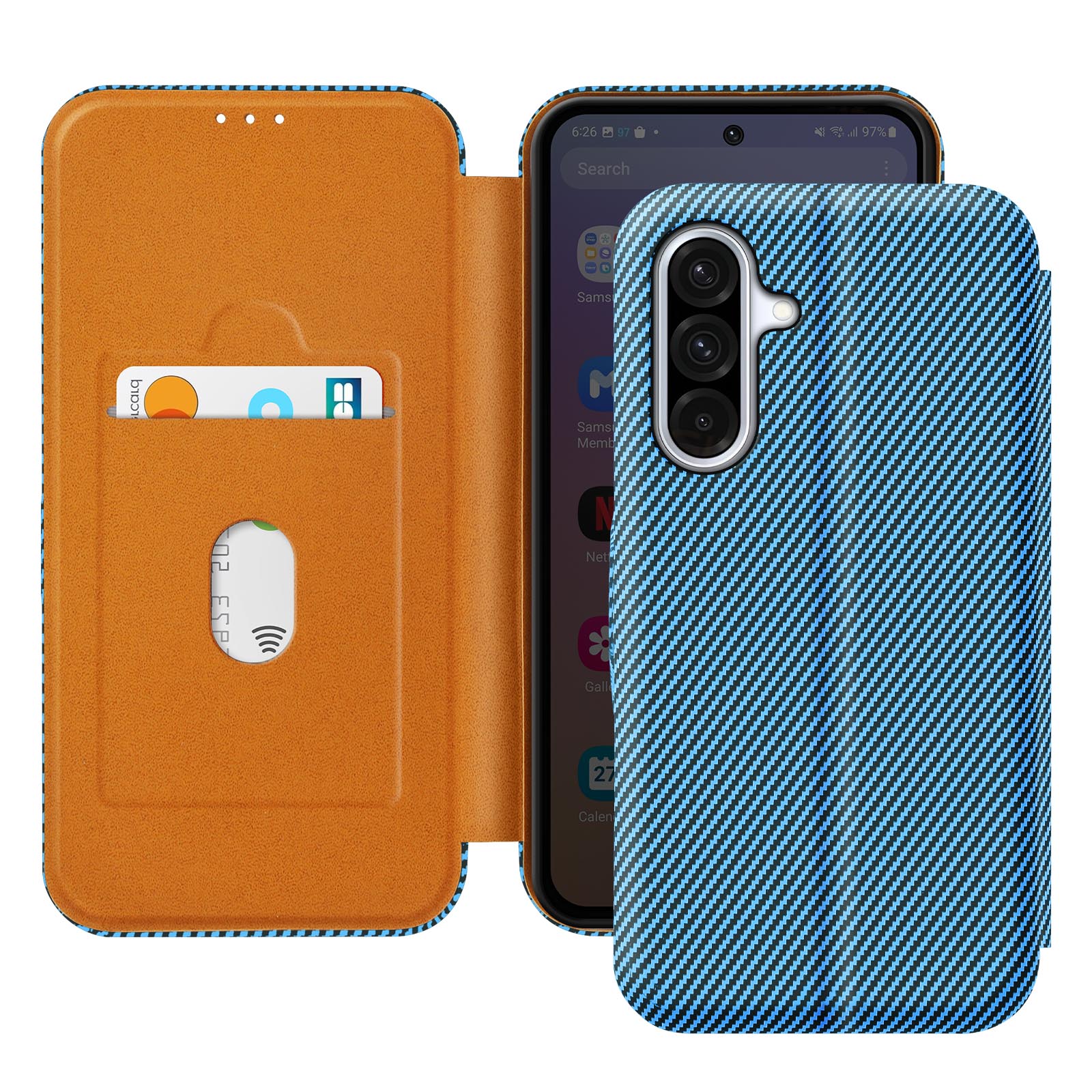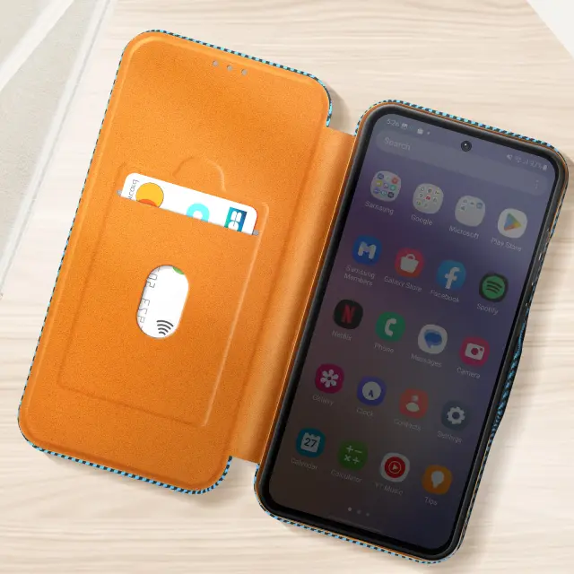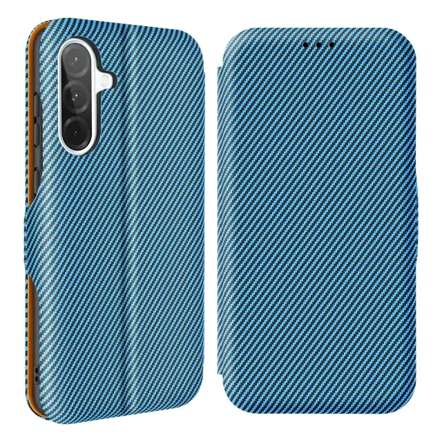 Modro ohišje folio s prefinjenim karbonskim vzorcem, ki prinaša slog in zaščito za vaš Samsung A36. Udarcem in praskam odporen material iz imitacije usnja, odličen za dolgotrajno zaščito. Dvignjen rob za zaščito fotoaparata pred drgnjenjem in praskami. Zanesljivo magnetno zapiranje ohranja telefon na mestu, tudi če ga spustite.