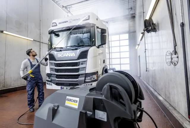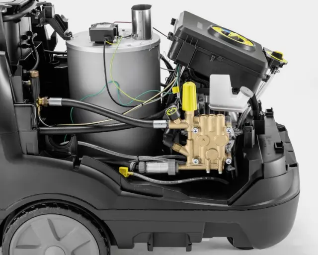 Visokotlačni čistilnik na vročo vodo s 4-polnim, vodno hlajenim elektromotorjem in avtomatskim navijanjem cevi spretno združuje uporabniku prijazno udobje z največjo zmogljivostjo.