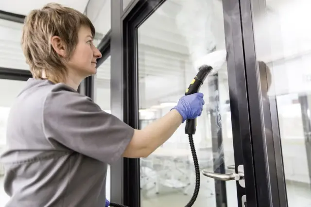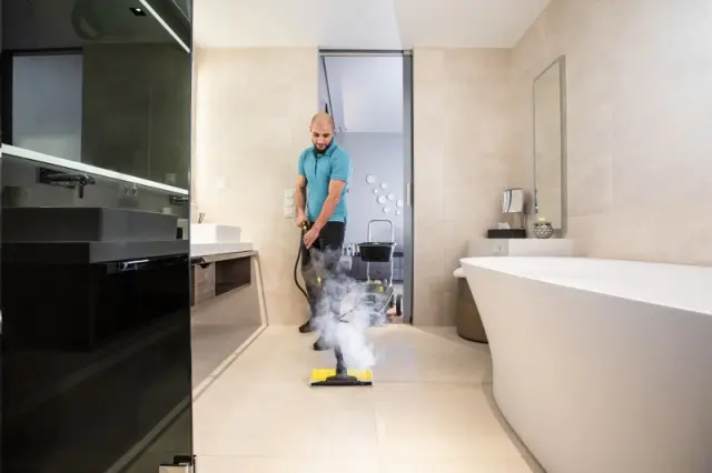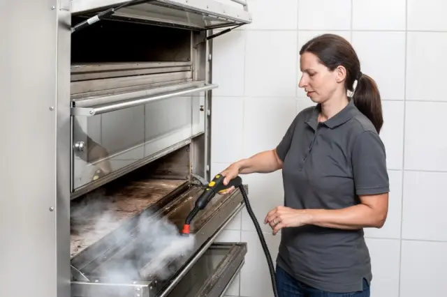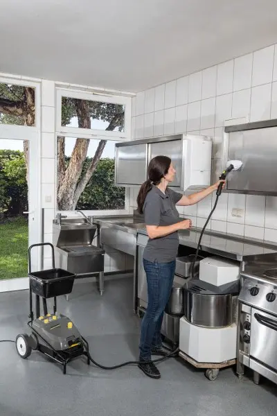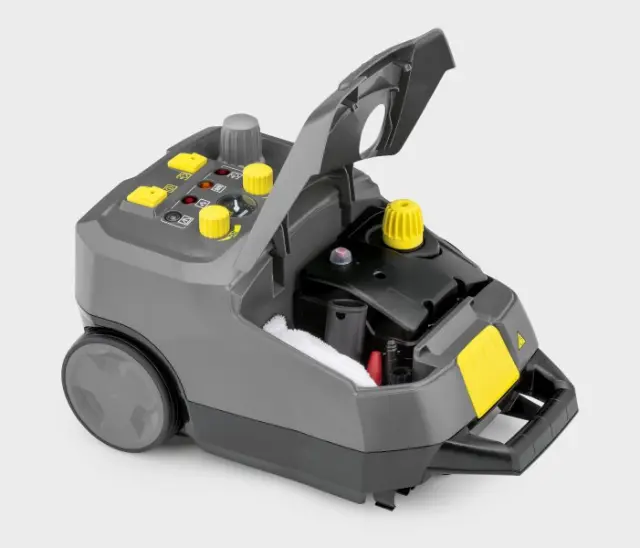 SG 4/4 je kompakten in trpežen parni čistilnik, ki vas bo prepričal z odlično zmogljivostjo in certificirano dezinfekcijo*. Zahvaljujoč parnemu tlaku 4 bar lahko Dosežete optimalno učinkovitost čiščenja. Brezstopenjska nastavitev količine pare in funkcija VapoHydro (brezstopenjska nastavitev nasičenosti pare) omogočata odlično prilagoditev delovanja naprave glede na dane naloge čiščenja. Zahvaljujoč sistemu 2 rezervoarjev je možno neprekinjeno polnjenje, kar omogoča hiter čas ogrevanja naprave ter delo brez prekinitev. Tudi prikaz temperature pomaga pri doseganju kar najboljših rezultatov čiščenja. Napravo lahko uporabljate povsod in čisti povsem brez kemikalij. Obsežen paket opreme obsega med drugim dve talni šobi (za abrazivno in higienično čiščenje), vgrajen predal za pribor, vgrajen kavelj za kabel ter držalo za shranjevanje cevi. (*po prEN 16615, PVC tla, naprava: SG 4/4 (talna šoba z lamelami, 30 cm/sek., maks. parni tlak, min. VapoHydro) testni klici: Enterococcus hirae ATCC 10541)