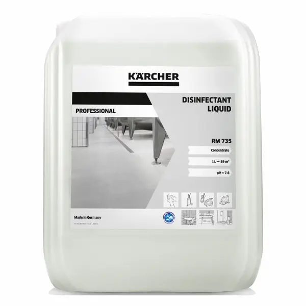 Naše tekoče razkužilo RM 735 je popolna izbira za uporabo v javnih poslopjih, hotelih in gostinskih obratih, zdravstvu ter na številnih drugih mestih – preizkušeno skladno s standardom EN 14476 – navdušuje s svojo visoko učinkovitostjo pri boju zoper najrazličnejše patogene, vključno z novim koronavirusom SARS-CoV-2. Kljub učinkovitosti zoper bakterije, kvasovke in omejeno zoper viruse je zelo nežen do materialov in ga je mogoče uporabiti celo na akrilnem steklu (Plexiglas®), linoleju, PVC-ju in anodiziranem aluminiju. Mogoče ga je uporabiti kot običajno razpršilo za brisanje površin in nanesti na večje površine z razpršilnikom za čistila, s polirno-sušilnim strojem, z visokotlačnim čistilnikom ali napravo PS 4/7 Bp Mister. Razkužilo RM 735 se ponaša z nevtralno pH-vrednostjo, ne vsebuje aldehidov, fenolov, alkohola ali klora ter ne pušča dolgotrajnega vonja.