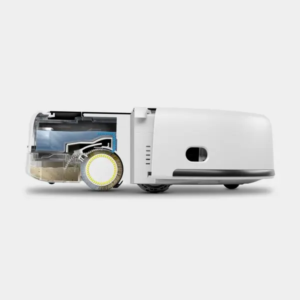 S pametnim sistemom z dvema rezervoarjema: valj iz mikrovlaken se nenehno navlaži s svežo vodo iz rezervoarja za svežo vodo. Uporabljena voda in umazanija se zbirata v 2. rezervoarju. Indikatorji napolnjenosti rezervoarja kažejo, ali je rezervoar za umazano vodo poln ali rezervoar za svežo vodo prazen. V obeh primerih robot prekine svoje delo in se vrne na polnilno postajo. Zaslon je prikazan preko LED diod neposredno na čistilnem robotu in tudi prek obvestila v aplikaciji. RCF 3: Zaznavanje preprog in izogibanje