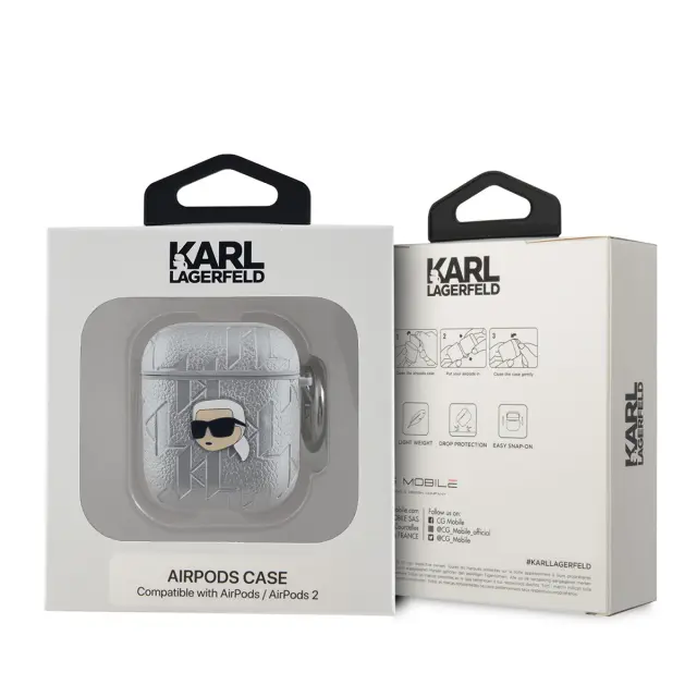 Karl Lagerfeld, Ohišje za AirPods 1 / 2 z monogramom in reliefnim motivom Karl Head, Srebrna