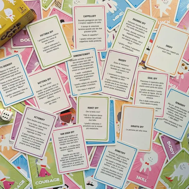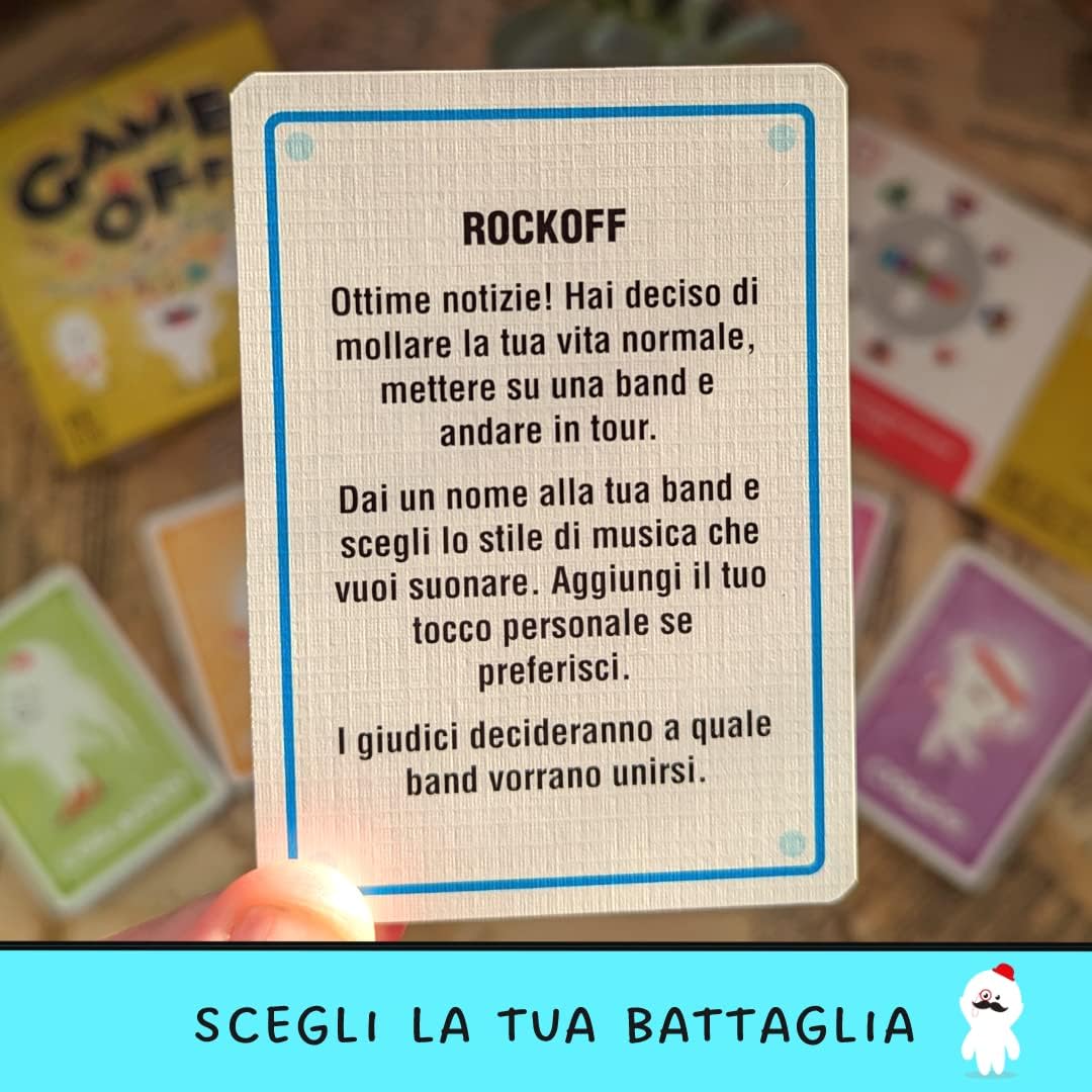Game Off je edinstvena družabna igra s kartami, ki združuje intenzivno zabavo z učenjem italijanskega jezika na lahkoten in dinamičen način. Igra je zasnovana za igralce vseh starosti in spodbuja razvoj telesnih spretnosti, uma, poguma ter ustvarjalnosti skozi hitre dvoboje. Uporablja se lahko v različnih okoljih, od sproščenih družinskih srečanj do strukturiranih izobraževalnih dejavnosti v šolah. Zaradi svoje zasnove omogoča aktivno sodelovanje vseh prisotnih, saj gledalci prevzamejo vlogo sodnikov in s svojim glasovanjem vplivajo na potek tekmovanja.