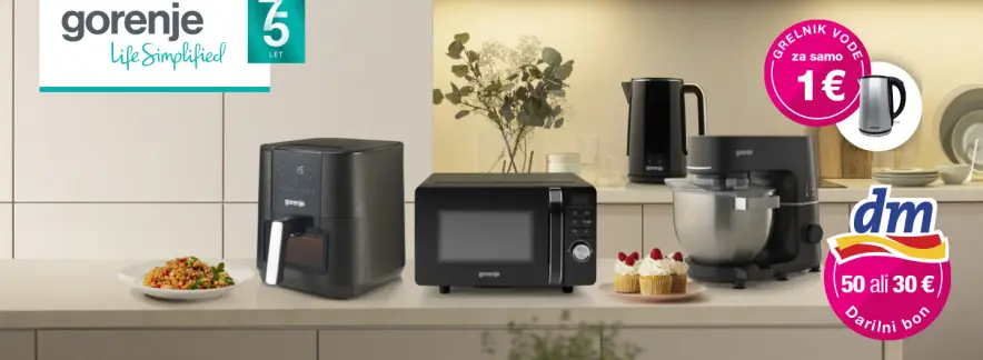 Ob nakupu izbranih malih gospodinjskih aparatov Gorenje pridobi dm darilni bon v vrednosti 30 € ali 50 € ali grelnik vode za samo 1 €. Izvedi več. Ponudba tgraja do 28. 2. 2025.