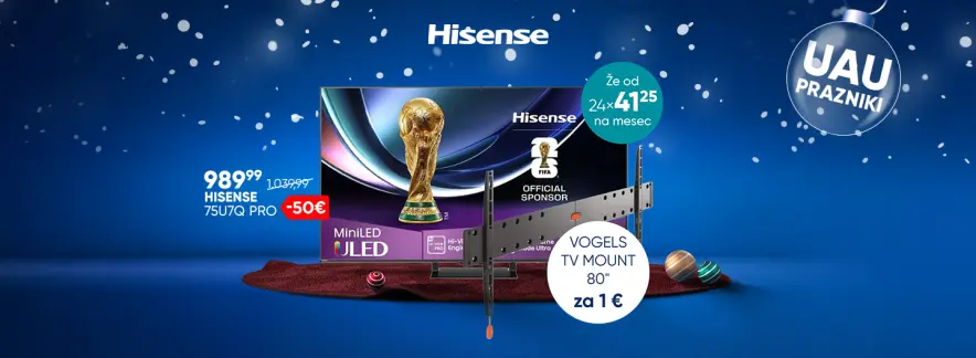 Ob nakupu Hisense televizorjev pridobi nosilec Vogels 80" za 1 €. Dodaj željeni televizor in nosilec skupaj v košarico in cena se bo avtomatsko znižala. Ponudba traja do 31. 12. 2025.