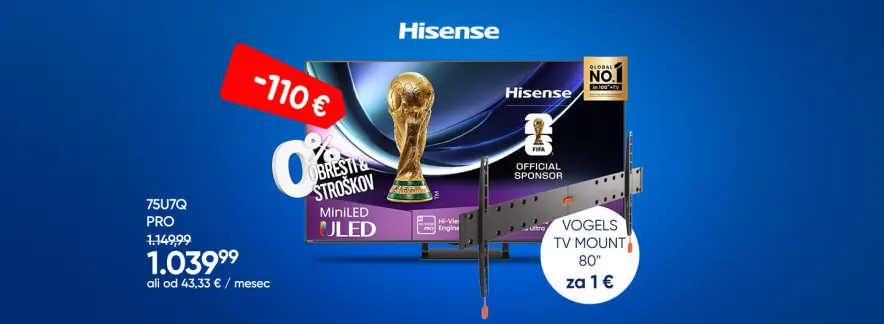 Nakupu Hisense televizorja z diagonalo 75'' ali več smo dodali nosilec za le 1 €!