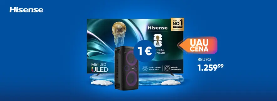 Ob nakupu izbranih Hisense velikih 85"(215 cm) ali več prejmi karaoke zvočnik Hisense Party Storm le za 1 €. Dodaj željeni televizor ter zvočnik skupaj v košarico in cena se bo avtomatsko znižala. Ponudba traja do 28. 2. 2026.