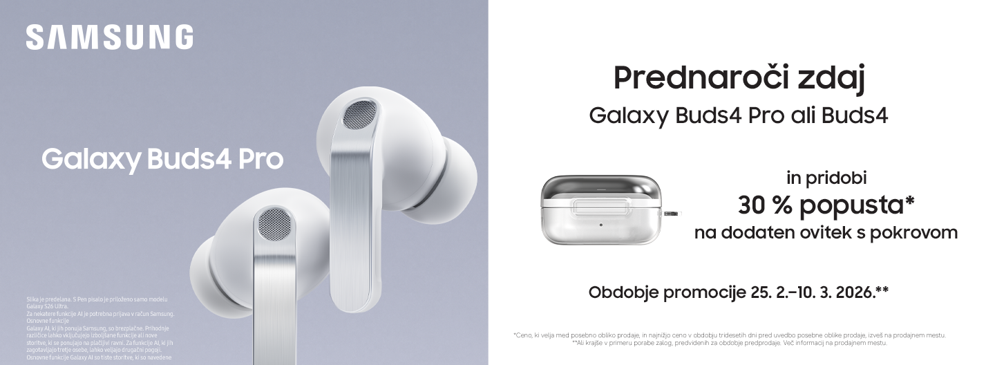 Dodaj na seznam željaUGODNOST OB NAKUPU Ovitek 30 % cenejeSlušalke SAMSUNG Galaxy Buds4 PRO, črne (R640)Prednaročilo - na voljo od 27.02.2026Prodajalec Big BangBrezplačna poštnina249,99 €ali od 12,21 € / mesec Prednaroči
