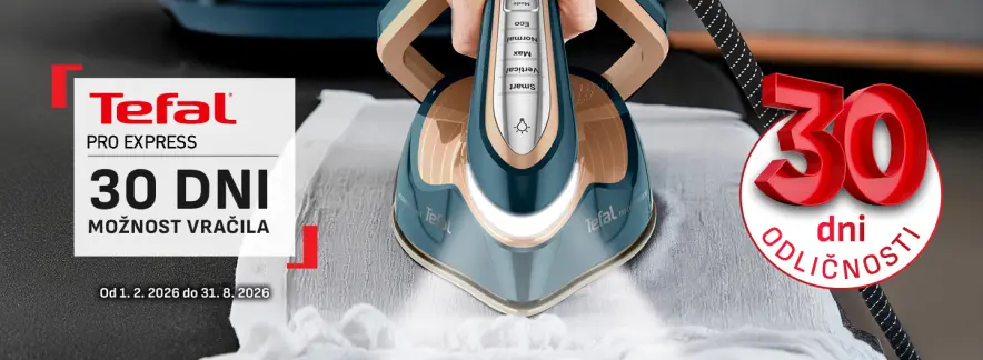 Tefal ti omogoča, da neobvezujoče preizkusiš vrhunske parne postaje Tefal linije PRO EXPRESS v roku 30 dni od nakupa. V kolikor ti izdelek ne ustreza popolnoma ali če ne bo izpolnil pričakovanj, ga lahko v roku 30 DNI od nakupa vrneš. zagotovljeno vračilo kupnine. Akcija velja od 1. 2. 2026 do 31. 8. 2026 za izbrane modele. Obrazec za vračilo.